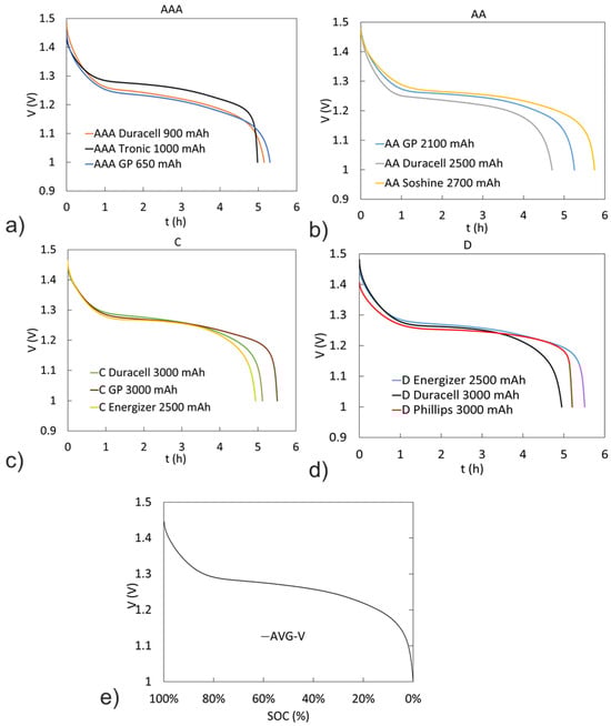 NiMH battery discharge profiles at 0.2 C and a cut-off of 1.0 V for different battery manufacturers of (a) AA, (b) AAA, (c) C, (d) D, and (e) average SOC.