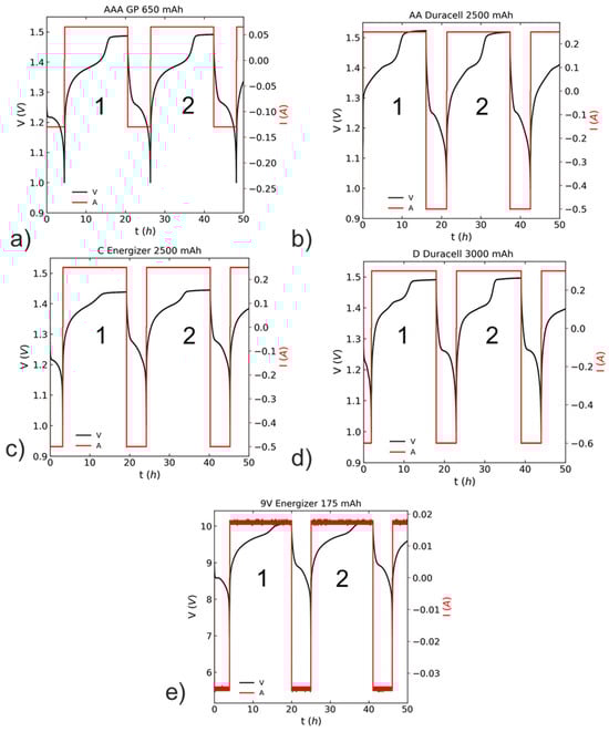 The AAA and AA NiMH battery voltage and current profiles are presented in Figure 7a,b. As expected, the AAA and AA batteries have similar voltage and current shape profiles. In both cases, the batteries do not reach the manufacturer’s rated capacity in the first cycle. However, in the second cycle, both batteries reached the rated capacity of 650 mAh for AAA and 2500 mAh for AA, with a discharge time longer than 5 h (thus meeting the requirement in IEC 61951-2). Similar behavior is observed for the C and D NiMH batteries (see Figure 7c,d). Also in this case, both batteries reached the manufacturer-rated capacity after the second cycle. The 9V battery consists of 7 cells connected in series. The voltage profile rises continuously during charging from 7 V to 10 V (Figure 7e); during discharge, the battery reaches the rated capacity in the second charge/discharge cycle. It is observed that the charging and discharging currents tend to have small changes in the 9V battery; this may be due to the connections between the cells that create resistance for the current to be fully constant. However, the fluctuation of the current is 1% to 3%, which, to our knowledge, does not affect the outcome of the experiment.