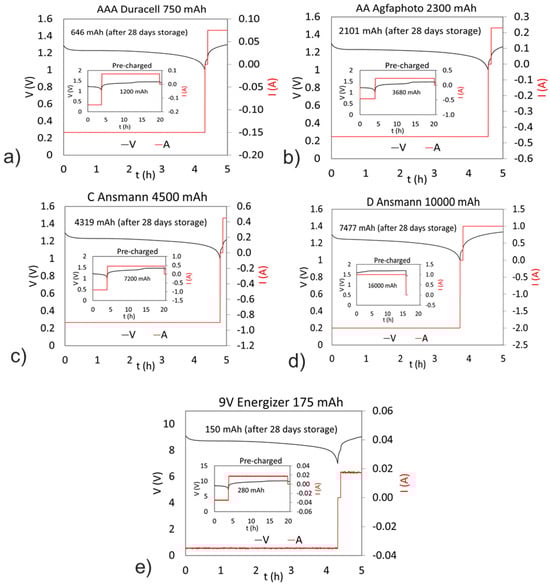 Figure 9a,b show the discharge profiles of AAA and AA NiMH batteries after 8 months of storage. The AAA and AA batteries have similar voltage profiles. However, as expected, the current values are different. This results in different capacity values of 912 mAh for AAA and 2095 mAh for AA. Furthermore, the corresponding current curves for C and D batteries are presented in Figure 9c,d. In this case, the C battery reaches a capacity of 3249 mAh and the D battery a capacity of 7117 mAh. In the case of the 9V NiMH (Figure 9e), the battery shows a discharge capacity of 260 mAh after the storage period of 8 months.