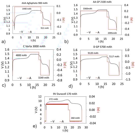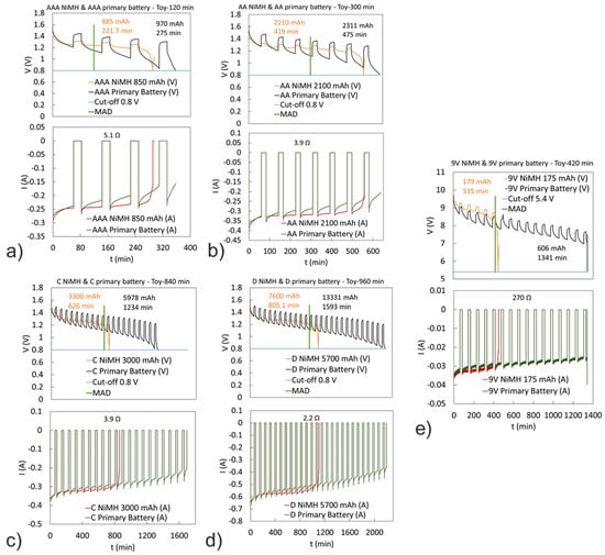 Figure 11 presents the voltage and current profiles of both primary and secondary batteries using the “toy” application test. Figure 11a,b show the comparison of portable NiMH batteries with primary batteries for the “toy” application test for the common designations AA and AAA, respectively. Both the AA and AAA portable NiMH can pass the “toy” application test (as well as the primary batteries) even without recharging. The difference between the primary and the secondary AA and AAA batteries is 56 min (4.37% capacity difference) and 54 min (8.76% capacity difference), respectively. In the case of the C (see Figure 11c) and D (see Figure 11d) and 9V (see Figure 11e) NiMH batteries, they cannot meet the duration requirement for the application test “toy” without recharging. The difference between the C and D primary and secondary batteries is smaller than in the case of the 9V battery (C = 608 min (44.8% capacity difference), D = 787.9 min (49% capacity difference), and 9V = 179 min (400% capacity difference)).