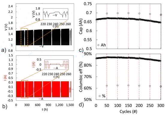 The voltage and current profiles of an AAA battery are presented in Figure 10a and Figure 10b, respectively. The charge termination voltage tends to increase from 1.49 V in the first cycle to 1.59 V at the end of cycle 300; this effect in voltage can be related to an increase in resistance in the cell after cycling and possible side reactions, e.g., gas formation []. Furthermore, the average capacity of the AAA NiMH battery during cycling is 660 mAh, and during the checkup cycle, a capacity of 698 mAh is observed (see Figure 10c). Additionally, the columbic efficiency of the AAA NiMH battery varies from 86% to 82% during the cycles and ~62% during the checkup cycle (see Figure 10d). This is consistent with the kinetics of the cathode (Ni(OH)2) and anode (MH), leading to higher capacity with lower C rates, which we have presented in Section 3.