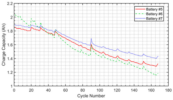 - Charge capacity: As shown in Figure 1, charge capacity represents the amount of charge the battery can store and deliver at any given time moment. Tracking the decline in charge capacity over time provides a direct measure of usable energy reduction, which is crucial for predicting the battery RUL. Figure 1 illustrates the trend of decreasing battery capacity over time (i.e., cycles) of three batteries from the dataset in [17], which reflects the normal curves toward eventual battery failure [5,6].