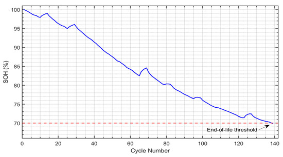 - State of health (SOH): The SOH indicates the battery’s health state as a percentage of its original capacity (100% when it is new). This metric provides a clear and quantifiable measure of battery health that reflects how much of the battery’s initial capacity remains as it ages. Monitoring SOH is essential for assessing degradation levels and predicting the RUL. In Figure 2, the SOH is calculated based on charge capacity using Equation (1), which illustrates the degradation over time for battery #5 until it reaches its end-of-life threshold, which is usually set at a 30% loss of the initial capacity [6,12]. This trend highlights the gradual decline in the battery’s ability to store and deliver energy as it undergoes repeated charge/discharge cycles, thus providing valuable insights into its remaining service life and performance reliability.