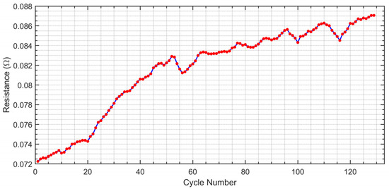 - Internal resistance: Figure 3 illustrates the progression of internal resistance as a function of the cycle number, highlighting its gradual increase over time. The data used to generate this figure is derived from the measurements of battery #6, providing an example of how internal resistance evolves during repeated charge/discharge cycles. This steady increase in internal resistance is caused by several underlying mechanisms including the breakdown of electrode materials, the formation of a solid electrolyte interphase layer, and the degradation of the electrolyte. These processes collectively reduce the ability of ions to move freely within the battery structure, leading to reduced battery efficiency and diminished power delivery. As internal resistance grows, it results in greater energy losses and increased heat generation, factors that can further impair performance, pose safety risks, and accelerate the degradation process. Therefore, monitoring this resistance trend is essential for understanding how battery performance evolves with age [7,9]. In general, internal resistance is a key indicator of battery health, which provides valuable insights into the battery condition and can help to predict when it will no longer perform effectively. Such predictions are critical for ensuring reliability in applications where consistent performance is essential, including electric vehicles, renewable energy systems, and aerospace technologies.