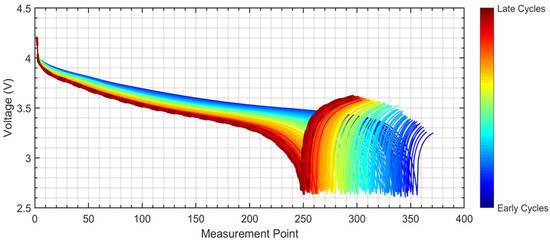 - Voltage characteristics: Analyzing voltage characteristics helps to detect early signs of battery degradation and to forecast its future performance and lifespan. Figure 4 illustrates the progression of voltage profiles during discharge cycles over time using data from battery #5. The x-axis represents the measurement points within each discharge cycle, while the y-axis shows the corresponding voltage values. A colour gradient is used to indicate the transition from early cycles (blue) to late cycles (red); this is to highlight the battery’s aging process over time. In the early cycles (depicted by blue curves), the voltage profiles are higher and more consistent, indicating the battery’s ability to deliver energy efficiently. As the battery ages (depicted by red curves), the voltage profiles shift downward and become smoother. This shift indicates a reduction in the battery’s energy delivery capacity caused by factors such as increased internal resistance, electrode degradation, and reduced ion mobility. These changes in voltage behaviour can serve as an early indicator of battery degradation and can be monitored to assess the battery’s state of health and predict its RUL [13,14].