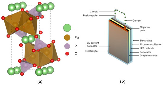 Illustration of (a) LFP crystalline material made using VESTA software version 3.90.1a [17] and (b) the construction of a single LFP battery cell.