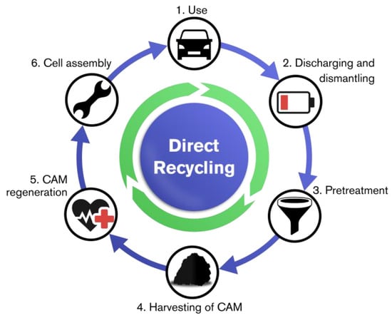 Unlike in pyro- and hydrometallurgical technologies, where the product normally comprises the constituent metals from the battery in various forms, such as alloys or metal salts, the aim of direct recycling is to regenerate (mostly) the positive electrodes, preferably to virgin performance. Other parts of the batteries could in theory be directly regenerated as well; however, with their much lower economic value compared to the cathodes, the incentives for this are not high. Thus, research has mainly focused on the direct regeneration of cathodes. Presently, direct recycling is still in the research or pilot phase owing to several challenges with industrial application, as discussed later. Figure 5 shows a flow chart of the way direct recycling theoretically functions, i.e., as a loop of battery usage and recycling, where the CAM is constantly regenerated and reused.
