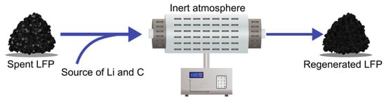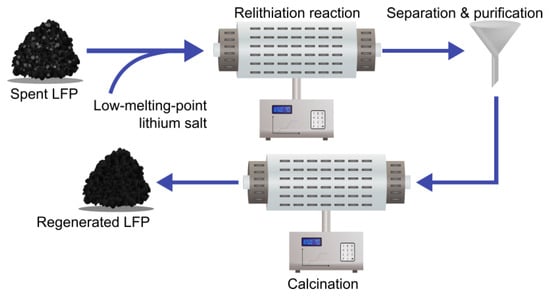Almost a subset of the thermal regeneration strategy, the molten salt approach follows the basic concept of thermal regeneration but uses Li salts that have a lower melting point than the temperature at which the reaction is run. As the Li source is effectively liquid, the main idea here is to practically solve the problem of having to calculate the correct amounts of Li salt for each sample, as well as the non-uniform distribution and crystallinity of the repaired LFP particles, as is the case in solid-state thermal regeneration [96,102,103,150]. Figure 7 shows a general flow scheme for this technique.