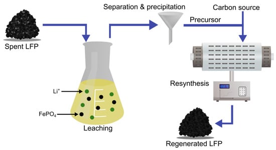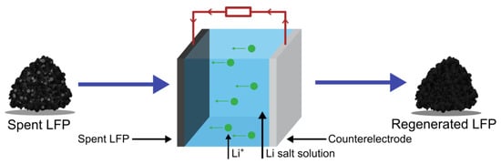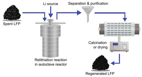 However, the generation of toxic gases that end up in the exhaust stream is also an issue for solid-state thermal regeneration. Moreover, it suffers from difficulties in ensuring uniform (a) distribution of the added Li+ in the regenerated CAM and (b) crystallinity and suitable morphology of the repaired LFP particles [96,102,103,150]. This poses a challenge for a possible industrial application, as spent batteries come in a large variety of degradation states. For that same reason, it is difficult to determine the exact appropriate amount of Li source that should be added to a batch of CAMs from different batteries, matching the amount of missing active Li [102]. Another disadvantage is the high energy consumption connected to the use of high temperatures for extended periods of time [147].