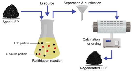 - Zhu, Y.; Jiao, X.; Bian, H.; Lu, X.-Y.; Zhang, Z. Direct relithiation and efficient regeneration of spent LiFePO4 materials through thermochemical healing. Ionics 2023, 29, 4569–4576. [Google Scholar] [CrossRef]