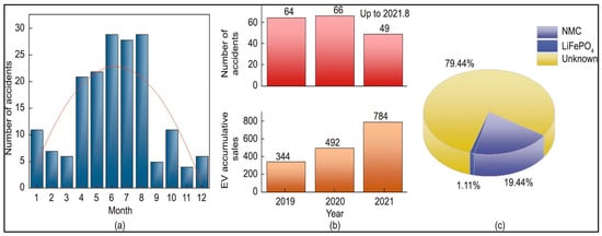 Compilation of EV fire occurrences from January 2019 to August 2021: (a) Monthly count of EV fire incidents. (b) Comparison of annual EV fire incidents and the total number of EVs sold. (c) Distribution of accidents attributed to various types of Li-ion battery [].