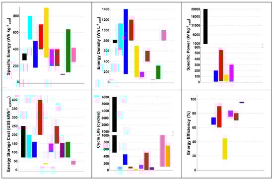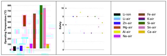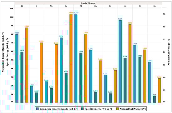 MABs have become prominent because of their efficient operation in outdoor settings, making them ideal for meeting the high energy requirements of EVs. Researchers anticipate that specific MABs will directly replace Li-ion batteries, while others will act as range extenders. This feature reduces range anxiety, enhances safety, and improves cost efficiency by decreasing the size of Li-ion batteries when they are not replaced directly. Figure 2 and Figure 3 give a visual summary of essential parameters influencing the selection and utilization of various metals in MAB technologies. Figure 2 presents a comparative analysis of the energy parameters of different metals used in MABs, highlighting the theoretical volumetric energy density in Wh L−1, specific energy in Wh kg−1, and nominal cell voltage in V. Concurrently, Figure 3 illustrates the cost and abundance of these elements, offering insights into their economic feasibility and natural availability.