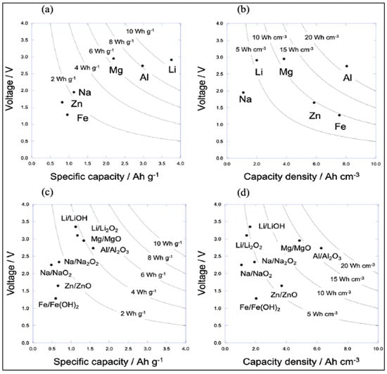 The metal’s mass and volume define the theoretical (a) specific energy and (b) volumetric energy density of MABs, whereas the plots (c,d) include the discharged products [].