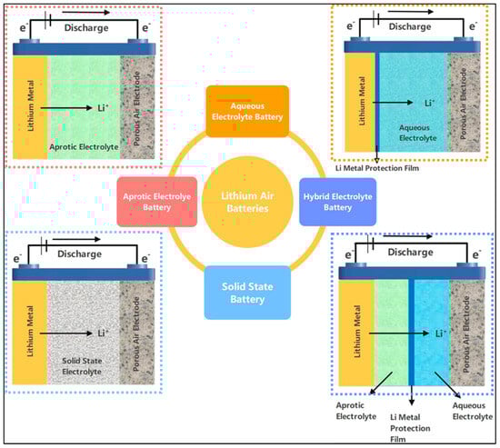 Classification of Li-air battery technologies with schematic representations. Modified from [].