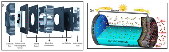 The operational mechanisms of both aqueous and non-aqueous MABs and the various configurations are depicted in Figure 4 []. In essence, these batteries consist of three key parts: an anode (metal), an electrolyte solution positioned between the electrodes, and a permeable air-cathode. The categorization of MABs by Wang et al. [] includes three distinct types: static battery setups with multiple cells, cell configurations with electrolyte flow, and innovative flexible battery designs.
