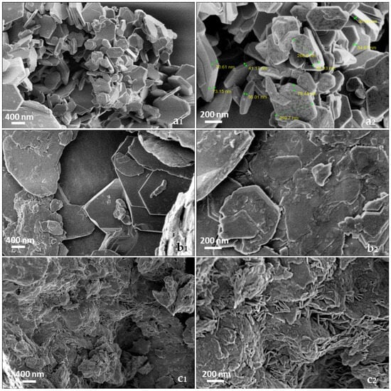 Figure 1(a1,a2) show SEM images of WS2 flakes. According to Figure 1(a2), WS2 flakes have a diameter between 260 and 460 nm and a width between 30 and 78 nm. Figure 1 shows that the thinnest WS2 sheets were obtained when the grinding of WS2 flakes took place at 900 rpm for one hour.