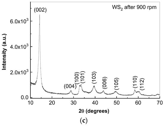 (a) XRD diagrams of WS2 nanoparticles before and after grinding at 150, 300, 600, and 900 rpm. (b,c) X-ray diagrams of WS2 nanoparticles before and after 900 rpm.