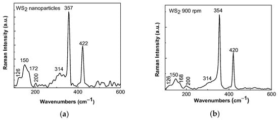 Raman lines at 126, 168–172, and 314 cm−1 were assigned to the vibrational modes Ag, Bu, and Ag of 1T’-WS2 []. The Raman line at 200 cm−1 belongs to the vibrational mode E’’(M) ‒ ZA(M) []. The Raman line that peaks at 150 cm−1 is situated no longer in terms of wavelength than that reported at 148 cm−1, which is characteristic of monolayer WS2 []. In Figure 4b, we can observe two Raman lines of WS2 sheets associated with vibrational modes E2g1 and A1g, which show a shift at cca. 354 and 420 cm−1, which has been attributed to the exfoliation of WS2 microparticles []. In the context of the exfoliation process of WS2 NPs, an important parameter is the distance between the two Raman lines associated with vibrational modes E2g1 and A1g and the ratio between their intensities (IEg/IAg). Careful analysis of Figure 4a,b reveals that (a) the distance between the Raman lines associated with vibrational modes E2g1 and A1g is equal to 65 and 66 cm−1, respectively, and (b) the IEg/IAg ratio is equal to 1.8 and 1.1, respectively.