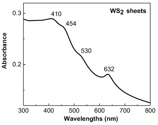 The UV-VIS spectrum of WS2 sheets mechanically exfoliated at 900 rpm, which were further dispersed into DMF by ultrasonication for 15 min (Figure 5), shows a band at 632 nm, accompanied by another band presenting one shoulder at 530 nm and another one at 454 nm, which were attributed to the exciton band, the transition of the indirect exciton, and the optical transition between the valence and conduction bands specific to the semiconductor character of the direct forbidden band [].