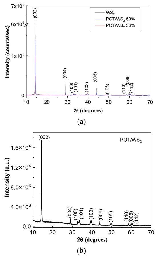 XRD diagrams of the POT/WS2 and POT-ES/WS2 composites were recorded with Bruker’s D8 Advance X-ray diffractometer (Bruker, Hamburg, Germany).