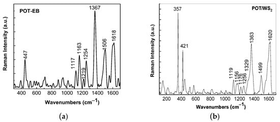 The Raman spectra of WS2, POT-EB, POT-ES, and the POT-ES/WS2 and POT-EB/WS2 composites were recorded using an FTRaman spectrophotometer, MultiRam model, from Bruker (λexc = 1064 nm, (Ettlingen, Germany)).