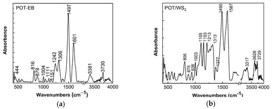 FTIR spectra of POT-EB (a) and POT/WS2 composite (b), obtained by ICP of OT, with a WS2 concentration in composite mass equal to 20 wt.%.