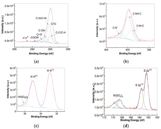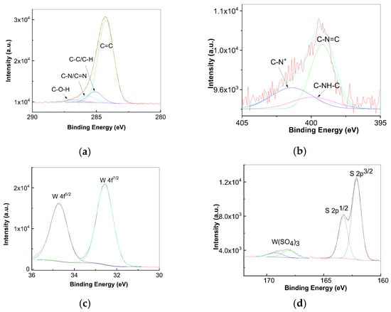 XPS C1s (a), W4f (c), S2p (d), and N1s (b) spectra of the POT/WS2 composite with a WS2 concentration in composite mass equal to 20 wt.%, synthesized by ICP of OT.