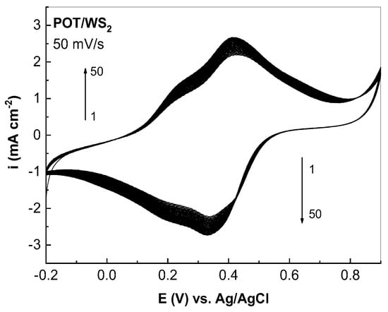 Figure 10 shows the first 50 cyclic voltammograms recorded in the potential range (−200; +900) mV vs. Ag/AgCl, using a semi-aqueous solution of 0.1 M OT in 0.5 M H2SO4 (the volumetric ratio of DMF/H2O was 1:1) and 0.5 mg/mL WS2 sheets exfoliated according to the protocol reported in this work.