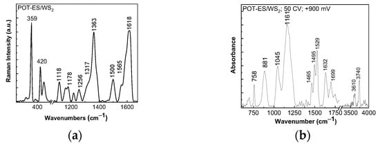 Raman spectrum (a) and FTIR spectrum (b) of the POT-ES/WS2 composite synthesized by ECP on the Pt electrode surface after recording 50 cyclic voltammograms.