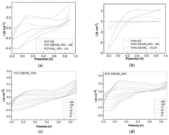 Figure 13 shows cyclic voltammograms of the POT-EB/WS2 and POT-ES/WS2 composites, prepared by SSI and ICP, respectively, when a Nafion membrane that interacted with H2SO4 1M was used as an electrolyte. A careful analysis of Figure 13a,b highlights higher values of the voltametric output currents of the POT-EB/WS2 and POT-ES/WS2 composites than of POT-EB and POT-ES. These results allow us to anticipate that the high capacitance value of the POT-EB/WS2 and POT-ES/WS2 composites would be obtained.