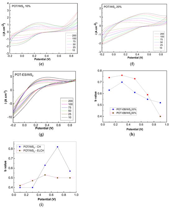 The 5th cyclic voltammogram of (a) POT-EB (black curve), the POT-EB/WS2 composite synthesized by chemical polymerization (with a WS2 concentration in composite mass equal to 50 wt.%, red curve), and the POT-EB/WS2 composite resulting from SSI of the two compounds when the WS2 concentration in the composite mass is equal to 20 wt.% (blue curve) and the scan rate is 100 mV s−1; (b) POT-ES (black curve), the electrochemically synthesized POT-ES/WS2 composite (blue curve), and the POT-ES/WS2 composite obtained by SSI when the WS2 concentration in the composite mass is 20 wt.% (red curve), when the scan rate is 100 mV s−1; the POT-EB/WS2 composites with a WS2 concentration equal to 33 wt.% (c) and 50 wt.% (d); the POT/WS2 composites, synthesized by ICP, when the WS2 concentration in the composite mass is equal to 10 wt.% (e) and 20 wt.% (f); and the POT-ES/WS2 composite synthesized by the ECP method (g). Black, red, green, blue, magenta, and dark yellow curves in (c–g) show the cyclic voltammograms recorded at 200, 100, 75, 50, 25, and 10 mV s−1. (h) The variation in the b value with voltage in the case of the POT-EB/WS2 composites synthesized by SSI of POT-EB with WS2 nanoparticles, when the WS2 concentration is equal to 33 wt.% (blue square) and 50 wt.% (red square); (i) the dependence of the b value on voltage for the POT/WS2 composites with the WS2 concentration of 20 wt.%, synthesized by chemical polymerization of OT assisted by WS2 (blue square), and the POT-ES/WS2 composites synthesized by the ECP method (red square).