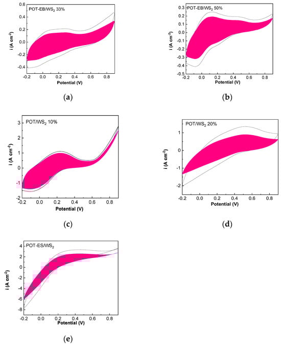Deconvoluted intercalation (pink area) and capacitance (white area) processes of the POT-EB/WS2 composites with WS2 concentrations of 33 wt.% (a) and 50 wt.% (b); the POT/WS2 composite with a WS2 concentration in the composite mass equal to 10 wt.% (c) and 20 wt.% (d), prepared by the ICP method; and the POT-ES/WS2 composite obtained by the ECP method (e), when the cyclic voltammograms were recorded at a scan rate of 100 mV s−1.