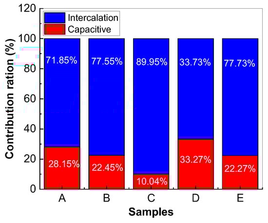 Contribution ratio between capacitive and diffusion processes of POT-EB/WS2 composites with WS2 concentrations of 33 wt.% (sample A) and 50 wt.% (sample B), the POT/WS2 composites synthesized by the ICP method (WS2 concentration in composite mass is 10 wt.% (sample C) and 20 wt.% (sample D)), and the POT-ES/WS2 composite synthesized by the ECP method (sample E).