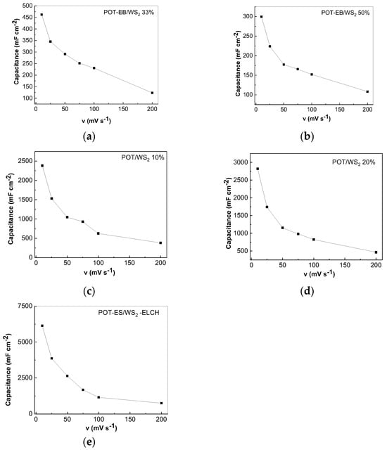 The dependence of capacitance vs. potential scan rate of electrodes based on the POT-EB/WS2 composites resulting from SSI with WS2 concentrations equal to 33 wt.% (a) and 50 wt.% (b); the POT-EB/WS2 composites synthesized by ICP with WS2 concentrations equal to 10 wt.% (c) and 20 wt.% (d); and the POT-ES/WS2 composite synthesized by the ECP method (e).
