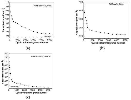 The variation in capacitance vs. number of cyclic voltammograms recorded at 200 mV s−1 of electrodes based on (a) the POT-EB/WS2 composite prepared by the SSI method, when the WS2 concentration in composite mass was 50 wt.%; (b) the POT/WS2 composite, synthesized by ICP (the WS2 concentration in the composite mass was 20 wt.%); and (c) the POT-ES/WS2 composite, synthesized by the ECP method.
