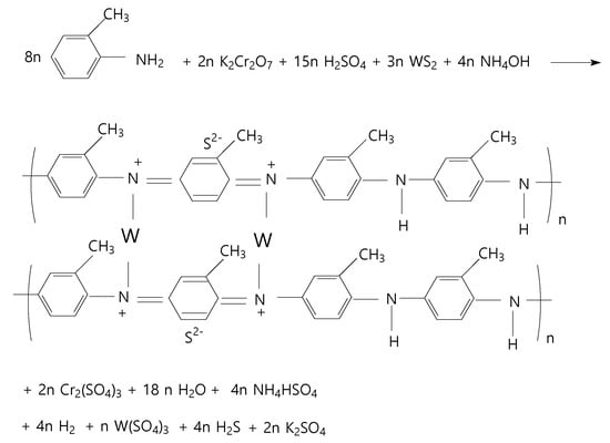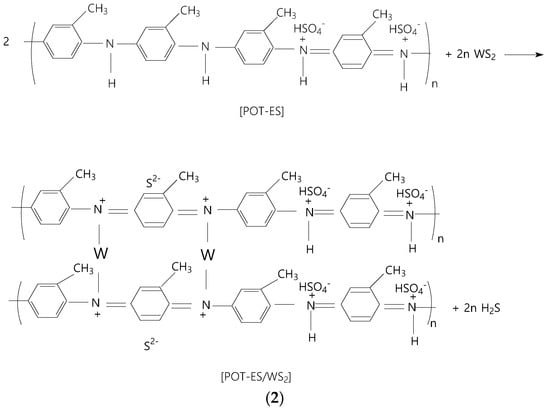 The mechanism of EC synthesis of the POT/WS2 composite: (1) oxidation reaction of POT-LS with the generation of POT-ES; (2) chemical interaction of POT-ES with WS2.