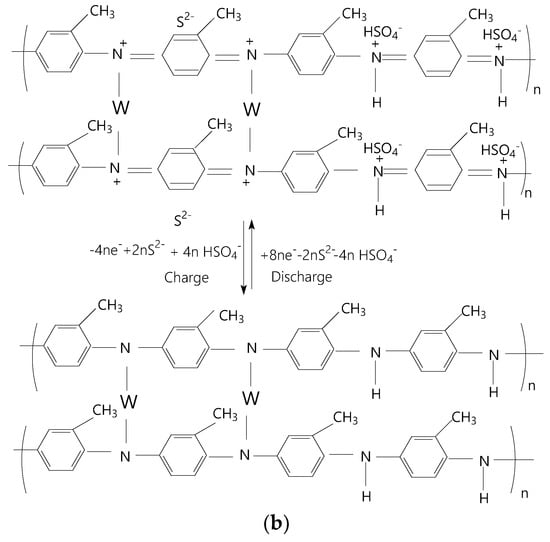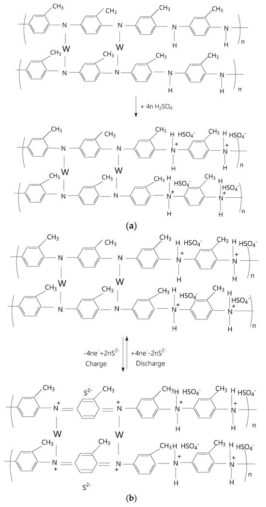 Reactions during discharge and charge processes in SC cell containing POT-ES/WS2 composite as EAM: (a) the reaction of the POT-LB/WS2 composite with H2SO4 (Equation (1)) and (b) charge/discharge processes of the POT-LS/WS2 composite (Equation (2)).