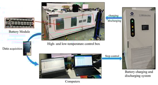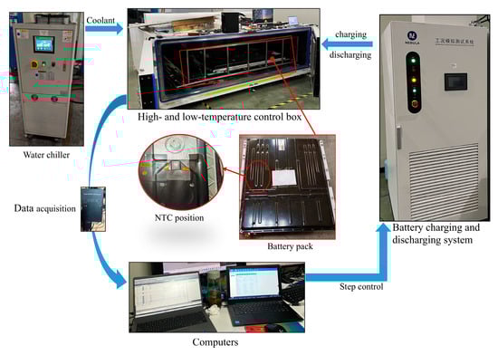- Connect the charge and discharge equipment and the acquisition equipment to ensure normal data acquisition. The high- and low-temperature control box adjusts the temperature to 25 °C, and the battery pack temperature is left to stabilize at 25 °C ± 2 °C.