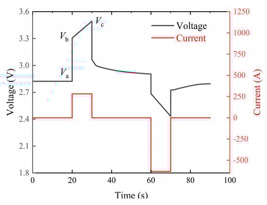 Throughout the testing process, the battery voltage at each period of rest is recorded to construct the open circuit voltage (OCV) curve of the battery, as depicted in Figure 3. The procedure of the battery internal resistance test is illustrated in Figure 4. After a charging pulse is imposed on the battery, the voltage instantaneously rises from to , and then ascends to as the charging concludes. The voltage variation characteristics depicted in Figure 4 can be interpreted as the instantaneous elevation of the voltage plateau by the ohmic internal resistance, and the slow rise of the voltage plateau during the charging process attributed to the polarization internal resistance []. During the charging process, the heat output of the battery is simultaneously influenced by the ohmic internal resistance and the polarization internal resistance. In this research, the internal resistance of the battery was computed based on the voltage variation in the charging pulse phase, and the expression is as follows: