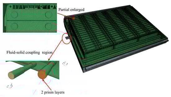 The meshing of the battery pack computational domain is carried out using polyhedral meshes, as depicted in Figure 5. Specifically, in order to improve the accuracy of the simulation of convective heat transfer in the fluid–solid coupling region, two layers of boundary layer with a total thickness of 1 mm were set in the coupling region. The calculation formula of the Reynolds number is as shown in Equation (11). The inlet Reynolds number was calculated to be 14,182 based on the flow velocity. Therefore, the flow state of the coolant is turbulent, and the K-Epsilon model was selected as the turbulence model. Considering the accuracy and computational cost of the numerical model, the maximum number of internal iterative steps was set to 10 at the beginning of the calculation and then to 2 when the calculation tended to be stable. The transient calculation method was adopted for the numerical simulation:
