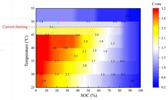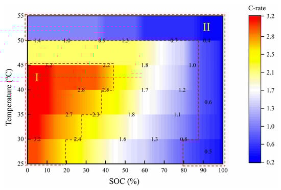 The battery fast charging strategy is designed to exert the maximum charging power of the cell under different SOCs and temperatures. The charging power of the battery is jointly determined by the voltage platform of the battery pack and the requested current. The aim of this study lies in applying the battery fast charging strategies to different cell platforms. Owing to the variations in the rated capacities of different cells, the fast charging strategy represented by current is not instructive. Hence, the fast charging strategy proposed in this study is based on the battery SOC-temperature-charging rate, and is illustrated in Figure 6. The maximum charging power of the cell adopted in this study is 3.2 C (384 A). The principal factors influencing the charging performance of the cell are SOC and temperature. During the process of fast charging, with the increase in SOC, the polarization phenomenon within the battery intensifies, leading to an increase in the internal resistance of the battery []. A rise in battery temperature will intensify the internal chemical reaction rate, resulting in an augmentation of the thermal stress within the battery. There is a risk of thermal runaway for batteries when they are charged at a high rate under conditions of high SOCs and temperatures. Therefore, the fast charging strategy needs to set distinct maximum allowable charging rates in accordance with different temperature and SOC intervals. As shown in Figure 6, the charging rate was restricted within the interval where the SOC is higher than 80% and the temperature is higher than 50 °C. When the battery is within the range of low SOC and low temperature, the maximum charging rate of the cell should be exerted. The charging rate is gradually decreased as the SOC and temperature increase, as shown in Region I in Figure 6. The charging rate undergoes stepwise transitions.