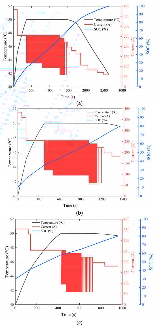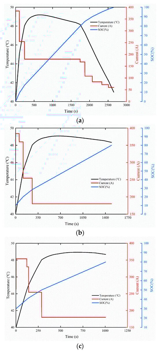 Comparison of fast charging performance in different SOC intervals: (a) Temperature, current, and SOC changes of 0–100% SOC charging; (b) temperature, current, and SOC changes of 10–80% SOC charging; (c) temperature, current, and SOC changes of 30–80% SOC charging.