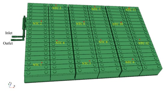 The variation of the charging rate in the fast charging strategy is regulated in accordance with the battery SOC and the Tmax. The data of the battery SOC were directly extracted from the data acquisition system. The battery pack in this study comprises 108 cells, and it is infeasible to extract the temperature of each individual cell during the charging process. Therefore, several representative cells were chosen within the high-temperature and low-temperature aggregation areas of the battery, and negative temperature coefficient thermistors (NTC) were arranged on the top surfaces of these cells to collect the temperature. As depicted in Figure 8, a total of 12 NTCs were arranged within the battery pack.