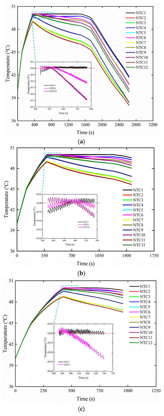 Comparison of NTC temperatures at different SOC charging intervals: (a) SOC: 0–100%; (b) SOC: 10–80%; (c) SOC: 30–80%.