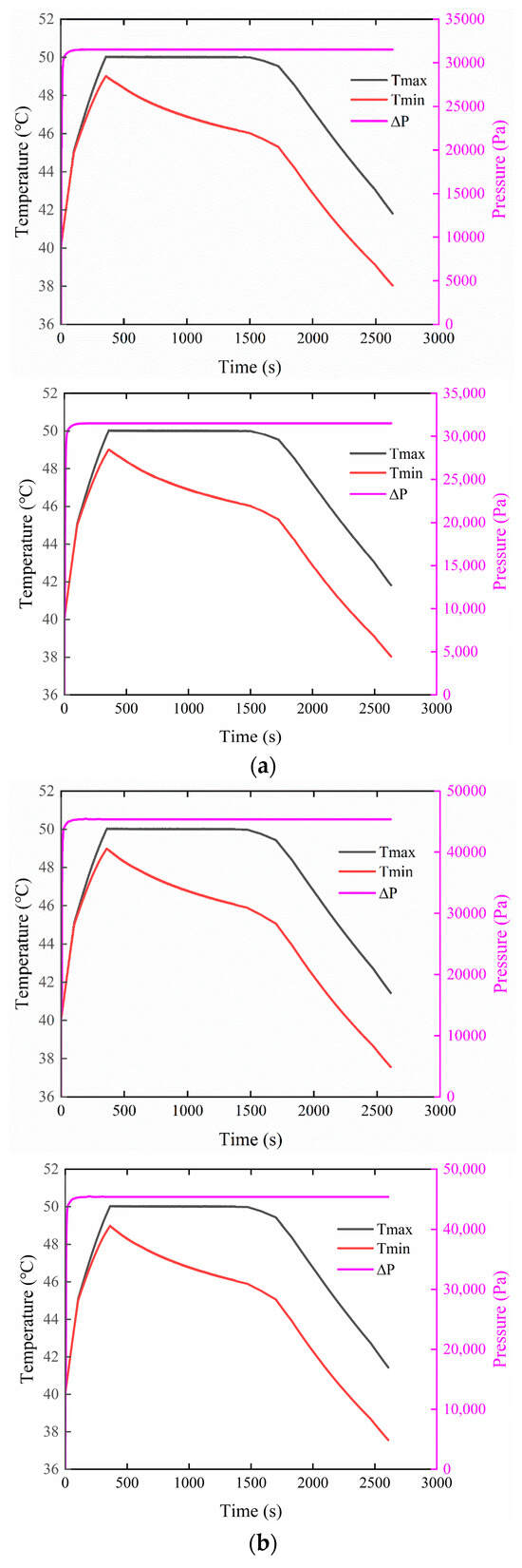 The heat transfer capacity of the liquid cooling system can be adjusted through the inlet flow rate. Specifically, when the inlet temperature of the coolant remains unchanged, enhancing the inlet flow rate of the coolant can boost the cooling capacity of the liquid cooling system. In this section, the rapid charging process of the battery with inlet flow rates of 12 L/min and 15 L/min was numerically simulated. Figure 10 presents the variation curves of battery temperature and cold plate pressure drop under the two inlet flow rates. As depicted in Figure 10b, when the inlet flow rate is elevated to 15 L/min, the Tmax of the battery during the charging process is 50.04 °C, the maximum temperature difference of the battery is 4.48 °C, and the maximum pressure drop is 45,373 Pa. In comparison with the inlet flow rate of 12 L/min, the increase in the inlet flow rate did not bring about an improvement in the Tmax of the battery. Instead, the increase in the inlet flow rate reduced the temperature uniformity of the cooling system. In terms of charging time, when the inlet flow rate is 15 L/min, the entire charging process lasts for 2609 s. The reduction in charging time is mainly because when the Tmax of the battery is within the fluctuation range, the heat generated by the cells can be quickly removed. When the inlet flow rate is raised from 12 L/min to 15 L/min, the fluctuation time of the Tmax of the battery is reduced by 37 s. Furthermore, with the increase in the inlet flow rate, the maximum pressure drop of the liquid cooling system rises by 44%.