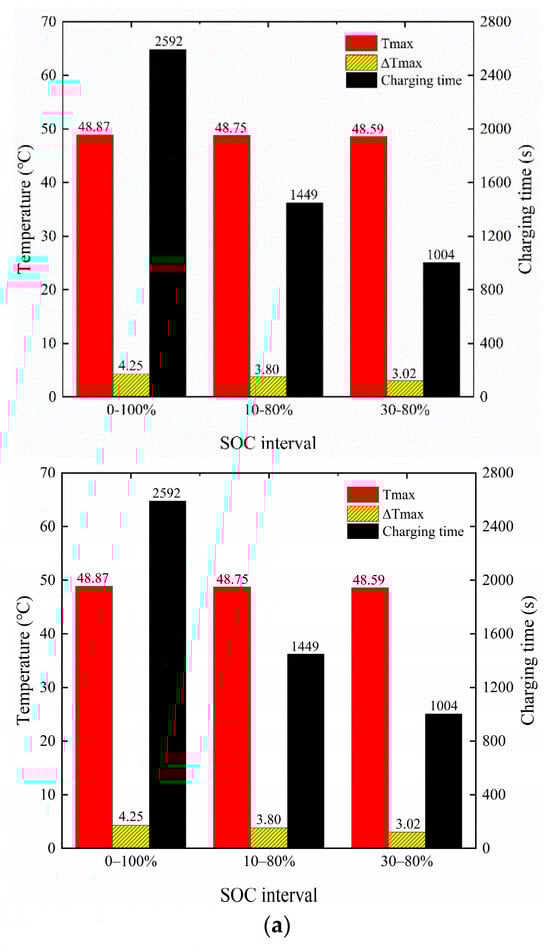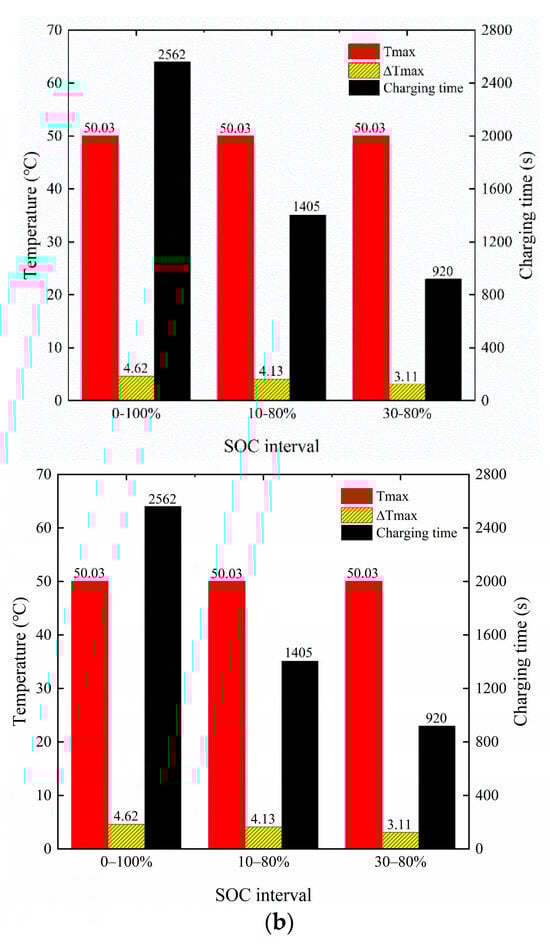 Figure 7b depicts the variations of current and Tmax during the charging process of the battery SOC from 10% to 80%. The initial charging current is 384 A (3.2 C), and it decreases to 360 A (3 C) at 57 s, with the SOC being 15%. As the charging proceeds, the Tmax of the battery reaches 50 °C at 379 s. Subsequently, under the effect of the cooling system, the battery temperature hovers around 50 °C. After charging until 1159 s, the battery temperature starts to decline gradually, and the SOC at this moment is 66%. The time taken for the battery SOC to charge from 10% to 80% is 1460 s.
