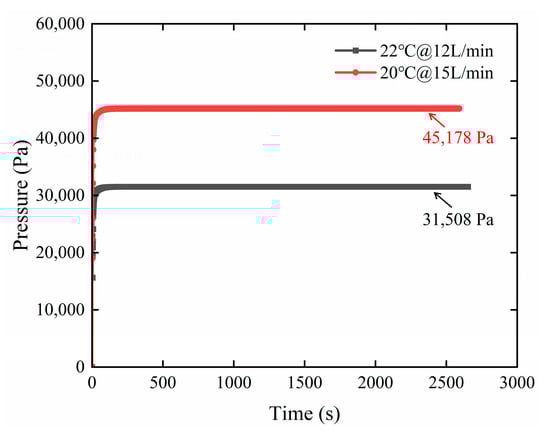 To investigate the influence of cooling strategies on the optimized fast charging strategy, in this section, the charging process with an inlet coolant temperature of 20 °C and a coolant flow rate of 15 L/min was numerically simulated. Furthermore, the charging process of the original fast charging strategy under the same conditions was numerically simulated. As depicted in Figure 14a,b, through the methods of reducing the inlet coolant temperature and increasing the coolant flow rate, the maximum temperatures of the battery were decreased by 0.32 °C, 0.33 °C, and 0.34 °C in the three charging processes, respectively. Similarly, the charging times were reduced by 62 s, 46 s, and 1 s, respectively. However, the increase in flow rate resulted in an increase in the pressure drop of the liquid cooling system. As depicted in Figure 15, when the cooling strategy was altered from 22 °C@12 L/min to 20 °C@15 L/min, the pressure drop of the liquid cooling system rose by 13,670 Pa. From the aspect of pressure drop, the improvement in the optimized cooling strategy on battery temperature and charging time was not significant. As shown in Figure 14, the optimized fast charging strategy does not have an advantage in charging time compared to the original fast charging strategy. However, the Tmax of the battery can be maintained below 50 °C, which has a positive effect on battery thermal safety and cell life.