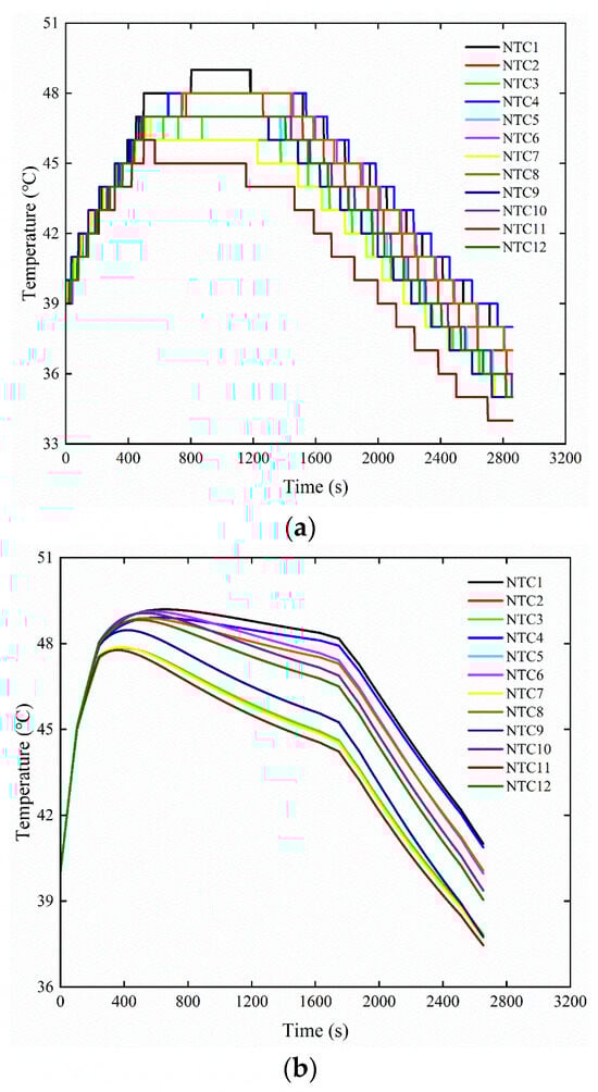 Figure 17 presents the comparison of the experimental and simulation data of the 12 temperature acquisition points. Since the acquisition accuracy of the temperature sensor adopted in the experiment is ±1 °C, the temperature curve in Figure 17a is stepped. The temperature data measured experimentally exhibit the same variation trend as the simulation data. As depicted in Figure 17a, the experimental data indicates that the high-temperature zone of the battery is primarily concentrated in the regions where NTC1, NTC4, and NTC6 are located, and the low-temperature zone is mainly concentrated in the regions where NTC3, NTC7, NTC9, and NTC11 are located. The high- and low-temperature regions of the battery measured experimentally are in accordance with the numerical simulation results. During the experimental process, the Tmax of the battery collected was 49 °C, and the maximum temperature difference was 5 °C. Compared with the experimental data, the error of the Tmax in the simulation data was 0.4%, and the error of the maximum temperature difference was 5%. The entire charging process of the experiment lasted 2860 s, which was 206 s longer than the simulation time. The deviation in charging time was mainly due to the fact that the step of switching the charging rate was manually set, resulting in a certain setup time. In summary, the numerical method adopted in this research is reliable.
