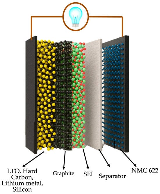 To probe these effects, five multilayer anode configurations were simulated in COMSOL Multiphysics using an NMC cathode [29], LiPF6 in EC:EMC (3:7) liquid electrolyte [30], copper and aluminum current collectors [31], at room temperature and a 1 C charge rate, over 2000 cycles (Figure 2). Additionally, a graphite particle diameter of 2.5 µm [24,32,33] and an equal layer ratio (50:50) were represented as two 30 µm-thick layers [34]. Particle sizes for the other materials were chosen according to the bibliographic recommendations (hard carbon: 2.5 µm [35,36]; lithium titanate (LTO): 0.2 µm [37]; metallic lithium: 0.5 µm [38,39]; and silicon: 0.1 µm) to ensure realistic diffusion and interfacial behavior in each layer [40,41].