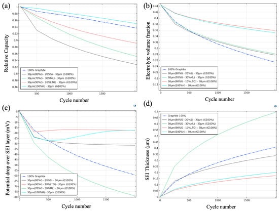 The identical 2000-cycle protocol yielded directly comparable electrochemical and impedance metrics. Upon the completion of all simulation runs (including twelve additional cases for hard carbon, LTO, and lithium-metal composites), the three highest-performing configurations were identified, together with the top silicon configuration from Phase I and the 100% graphite reference. For each of these five cells, the same response metrics were compared: SEI overpotential drop (mV), capacity fade (%), SEI thickness (µm), and electrolyte consumption (%).